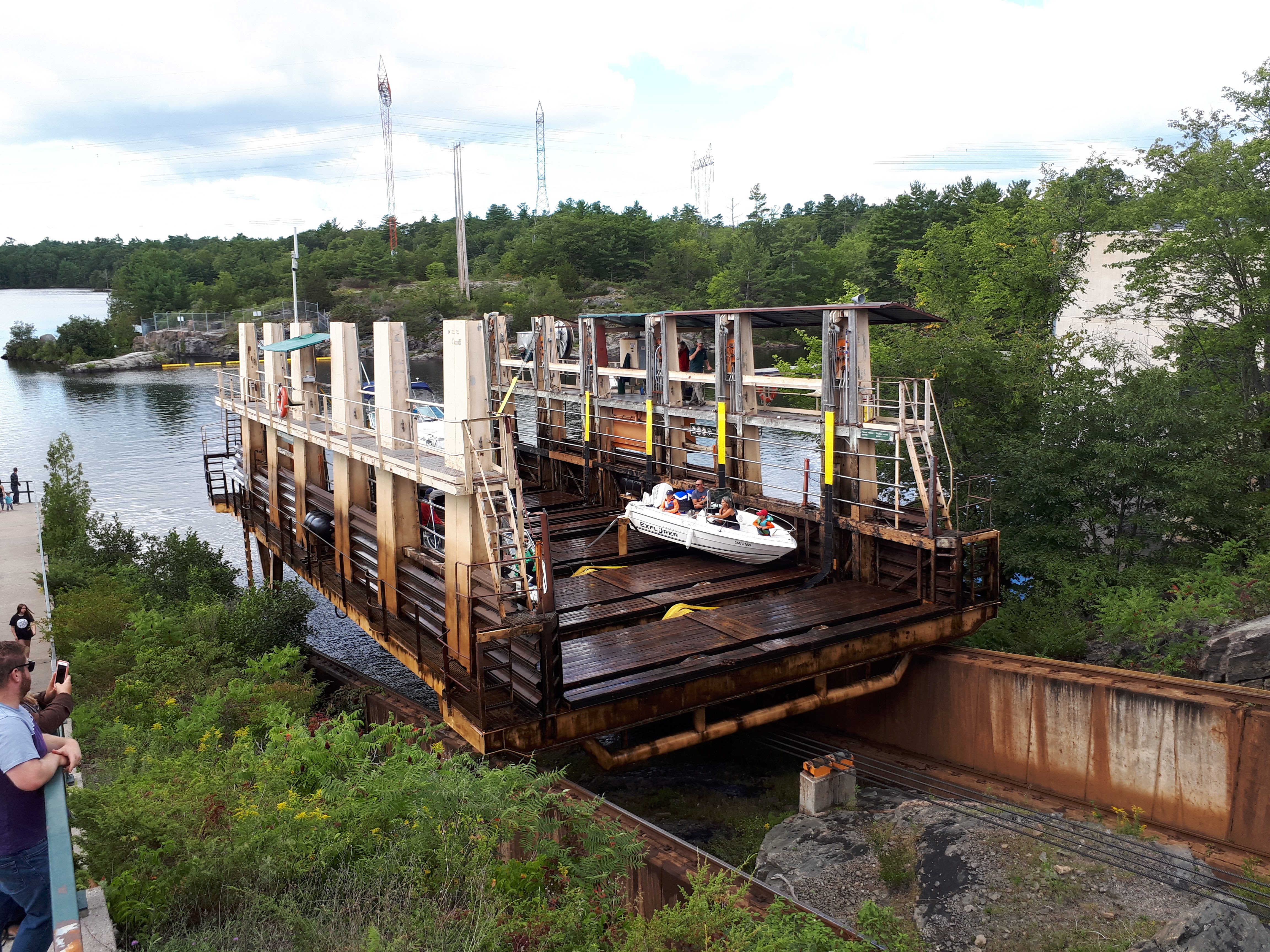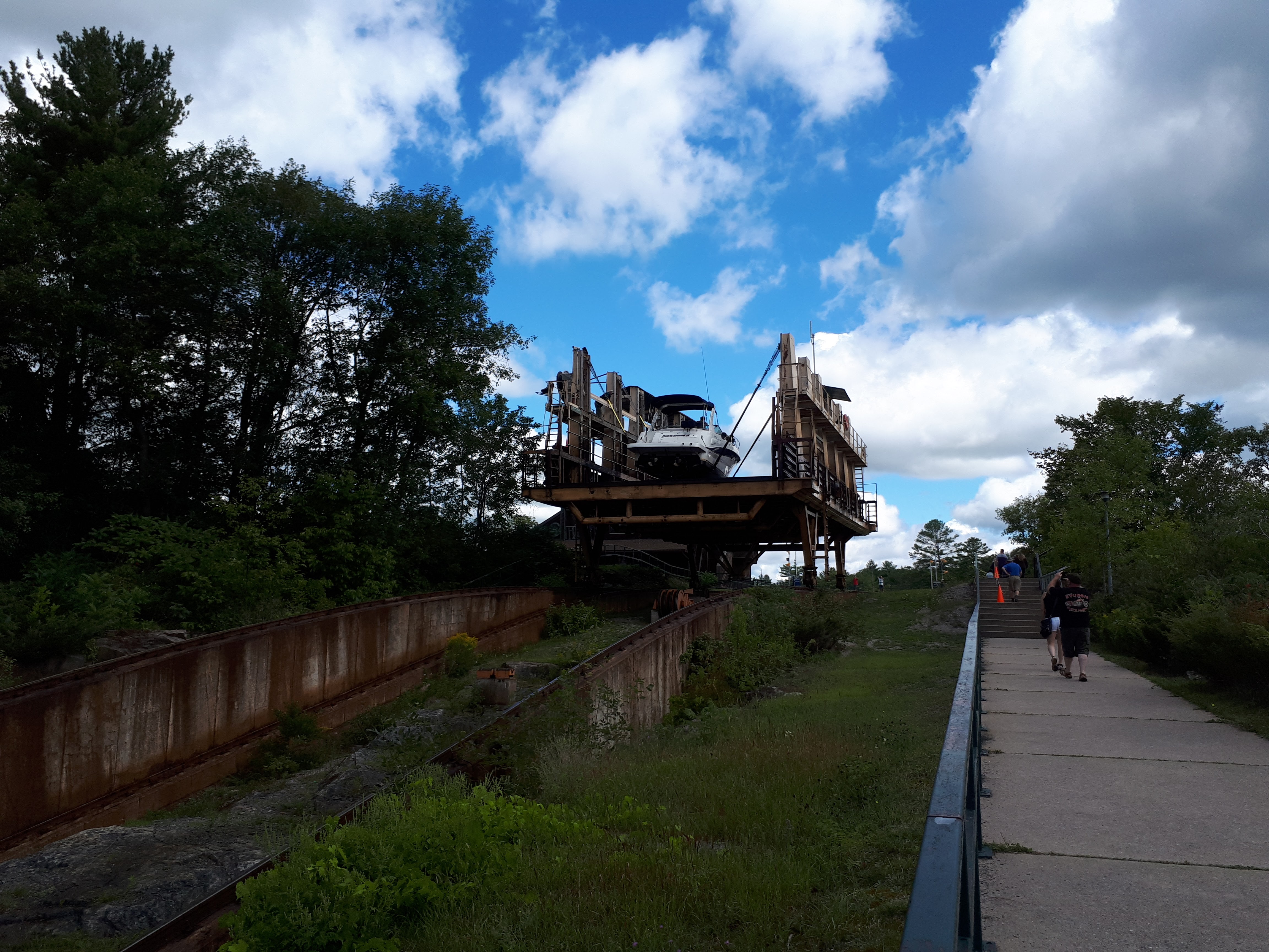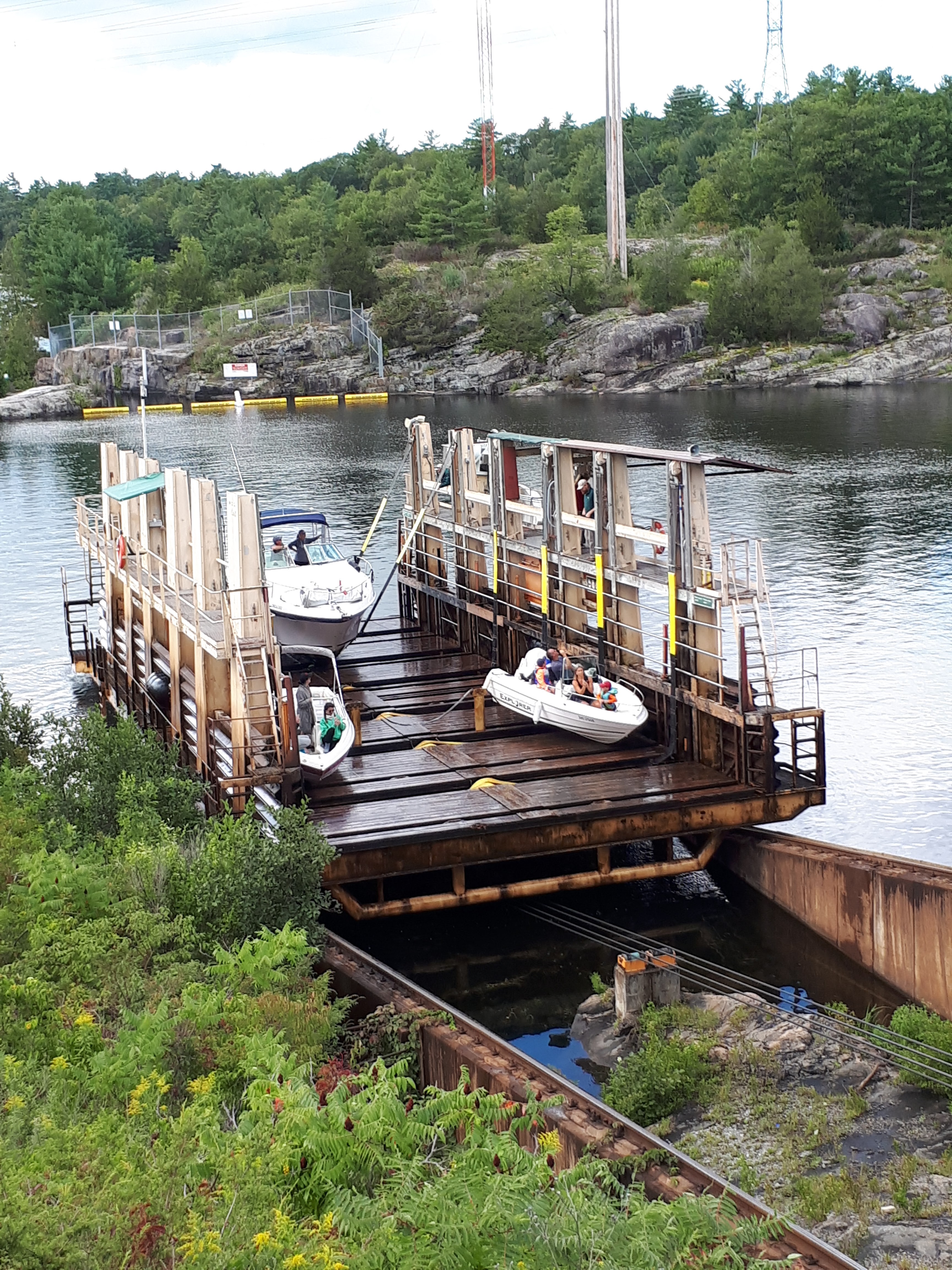 Boats going from one side to the other are loaded onto a rail car from the water, stabilized with straps, and then quickly moved along a rail track up an 18 metre incline, across a road, and deposited on the other side, all in a matter of minutes. It is much faster than it would be if locks were used, which was the original plan. This railway system was meant to be an interim measure, but is still operating 100 years later!