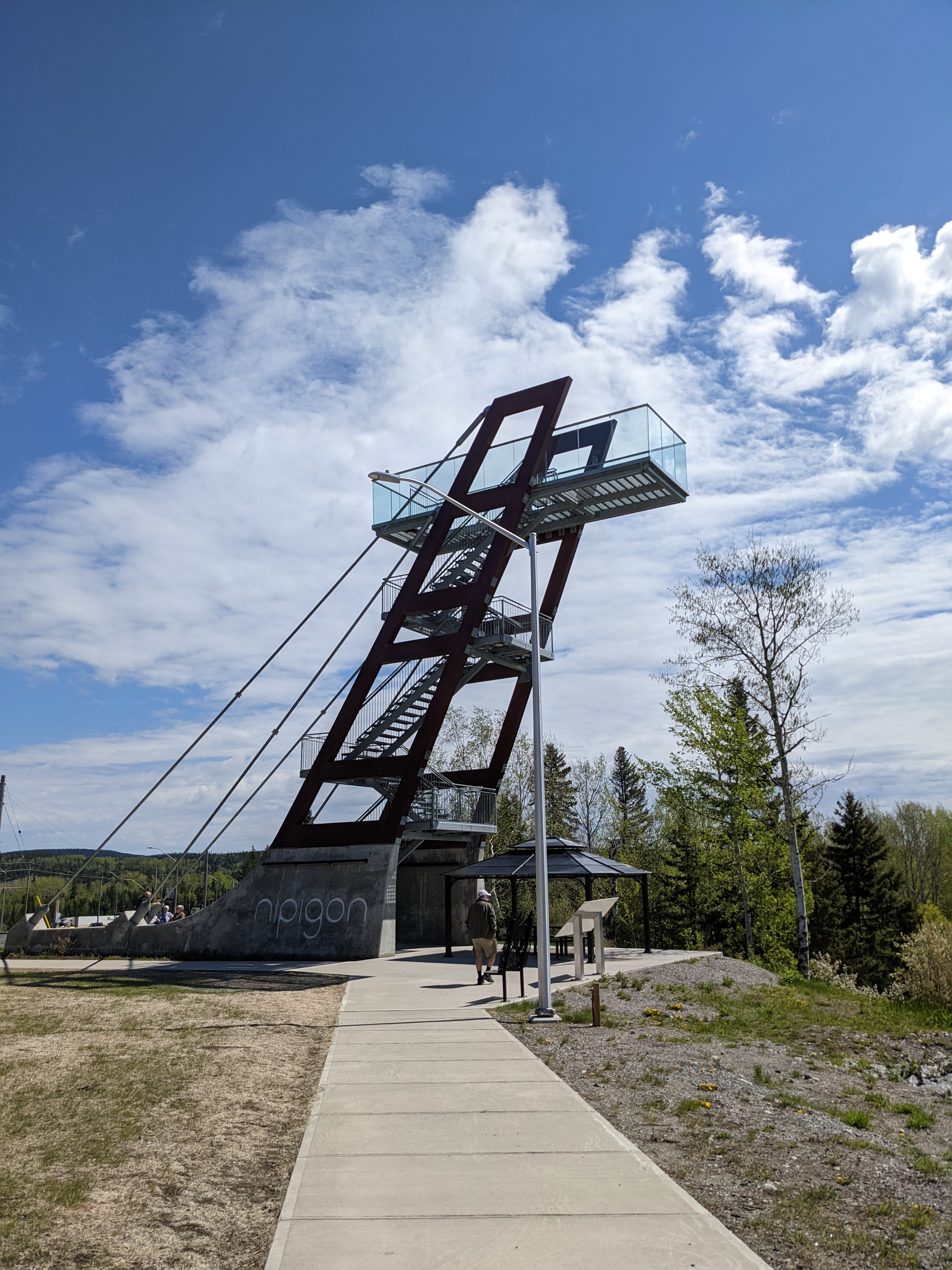 At Nipigon the TransCanada highway crosses the Nipigon River over a magnificent cable bridge built only a few years ago. It is very impressive to see, but is perhaps best know for a catastrophic failure shortly after opening that shut down the only land link across the country. But it was in fine form today, and there is a tower built nearby that provides a viewing platform for the bridge and the river.